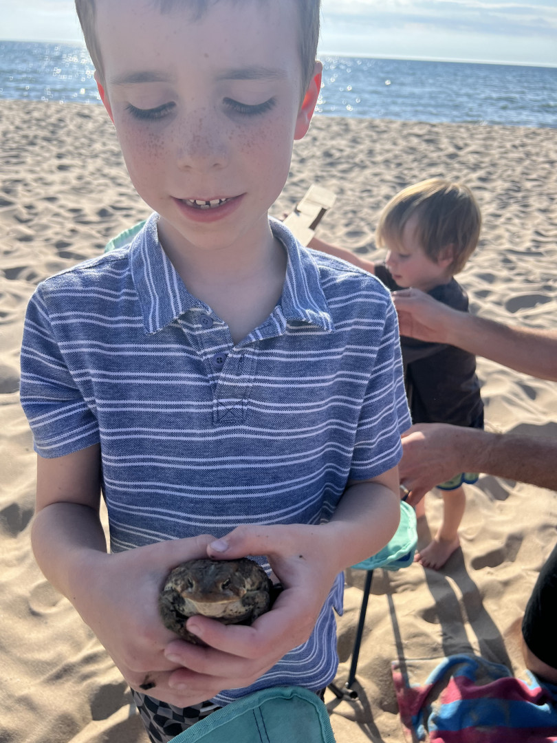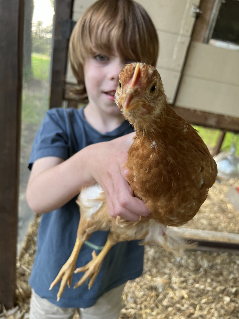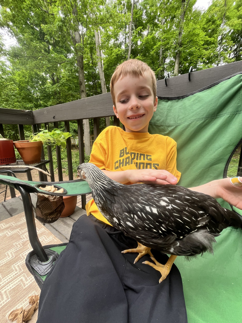 Auggie loves spending time with his chickens the most! He likes to explore the woods in our backyard. He also loves the lake and loves to look for fish, frogs, turtles, and water fowl. One of my favorite memories with him is witnessing an eagle dive for a fish while driving along the lake. He’s also the only person in our family to have foraged a morel mushroom and frequently collects litter on the beach.