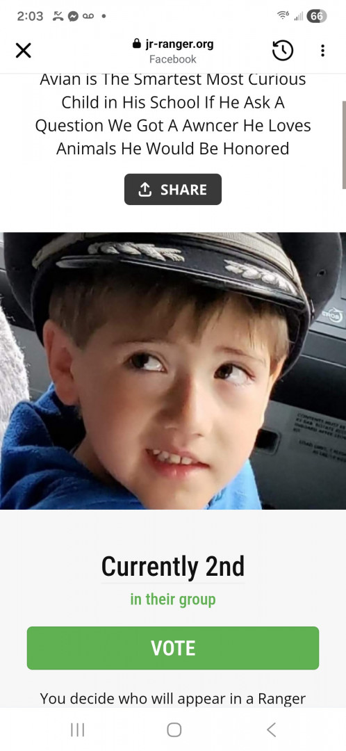Vote for Avian to become the 2026 Jr. Ranger while supporting a great cause! Cast your free daily vote below, or make an even bigger impact when you vote by donation—supporting the National Wildlife Federation in their mission to protect wildlife and preserve wild places for future generations.