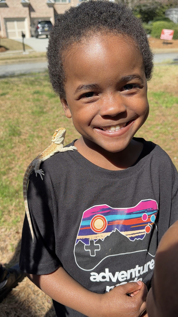Playing basketball with my brother and playing with my dog, Omega. I also like to play with my bearded dragon in the play pen outside.