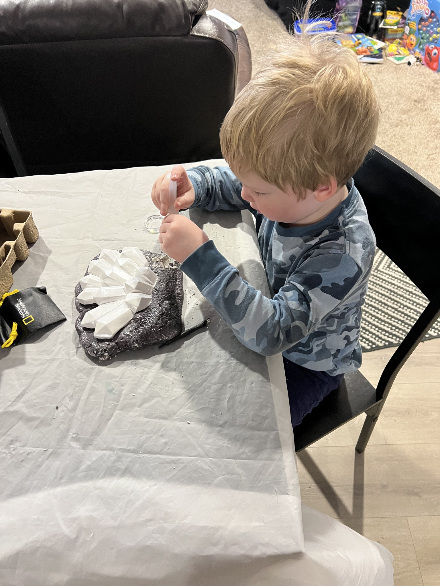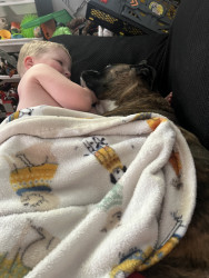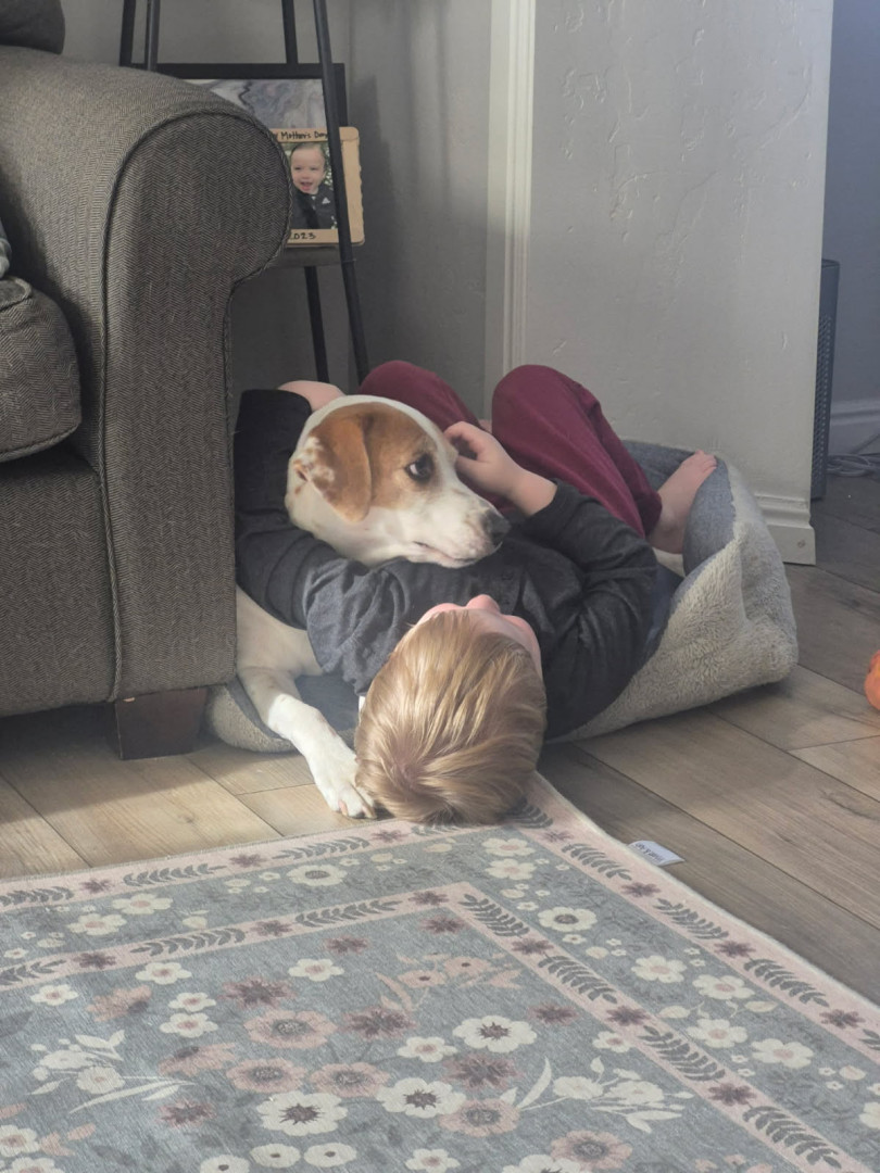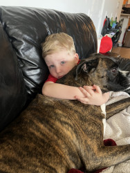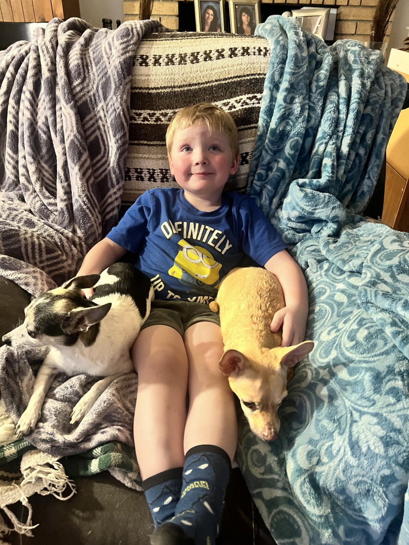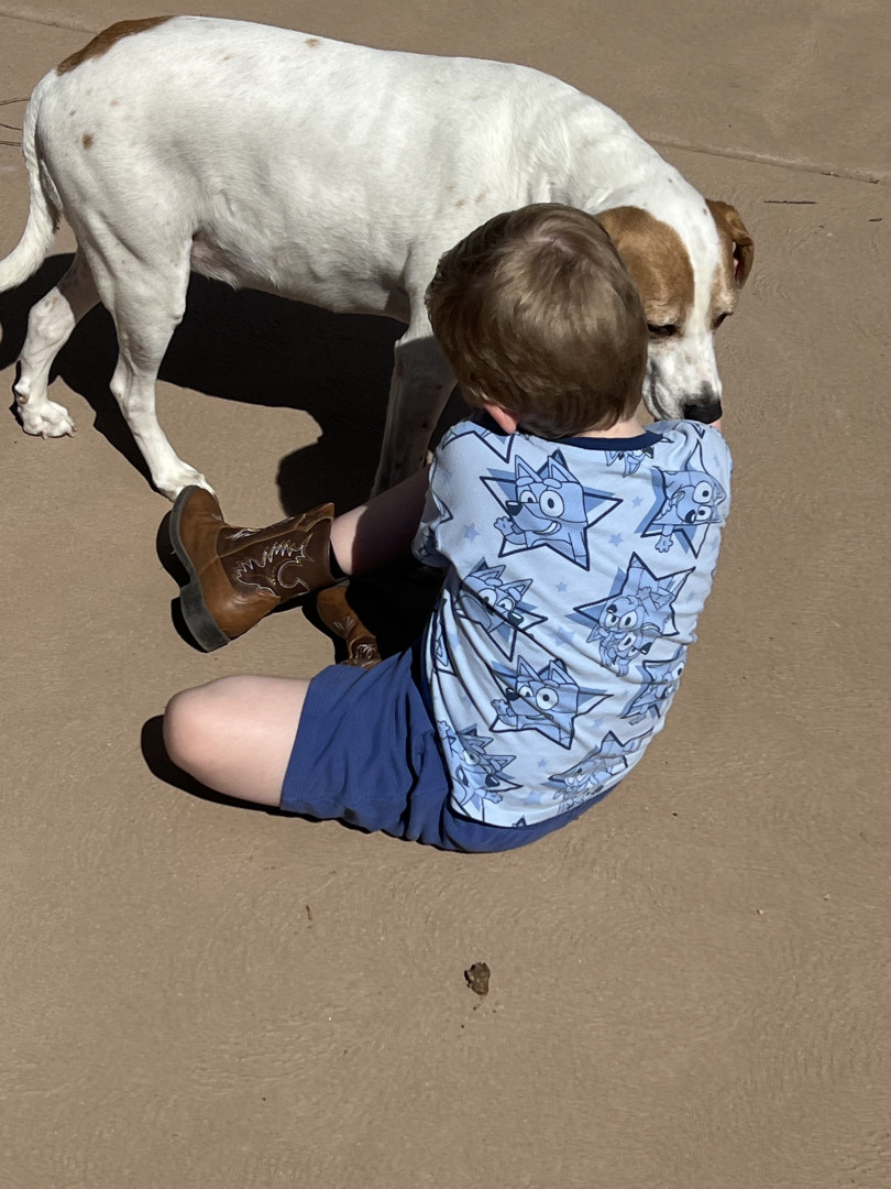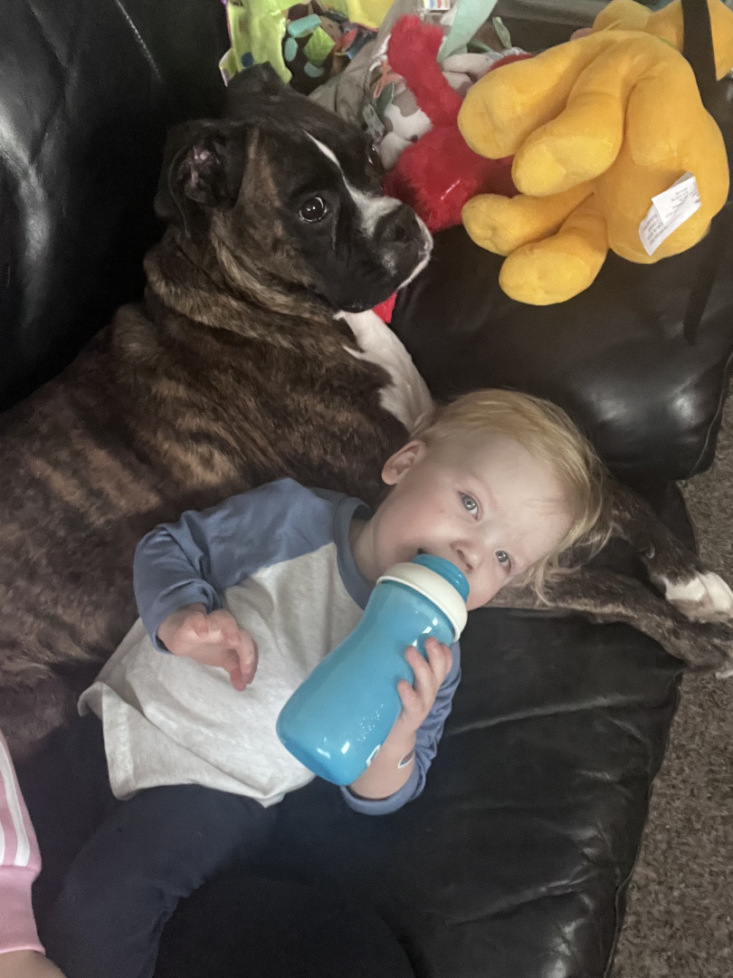 A dog because they are “fluffy, snuggly, and playful”! Zeke, our boxer pup, is Cooper’s best friend! They have an undeniable bond! When we are out and about or visiting someone’s house, you can find Cooper laying with, petting, playing, and loving on any dog that is present! Dogs are calming and therapeutic for Cooper as well!