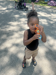 He loves to swim or splash in puddles. He likes watching bugs and birds. Also blowing and popping big bubbles.