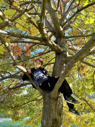 My favourite outdoor activity is exploring and climbing trees. From up high, I can see patterns in the forest and watch birds overhead, including peregrine falcons. I move slowly, looking for tracks, plants, insects, anything unusual. Then I research what I find, turning every hike into a science project. I also pick up litter on the nature trail behind my house so that animals can have cleaner habitats. I've noticed this often leads others to do the same.