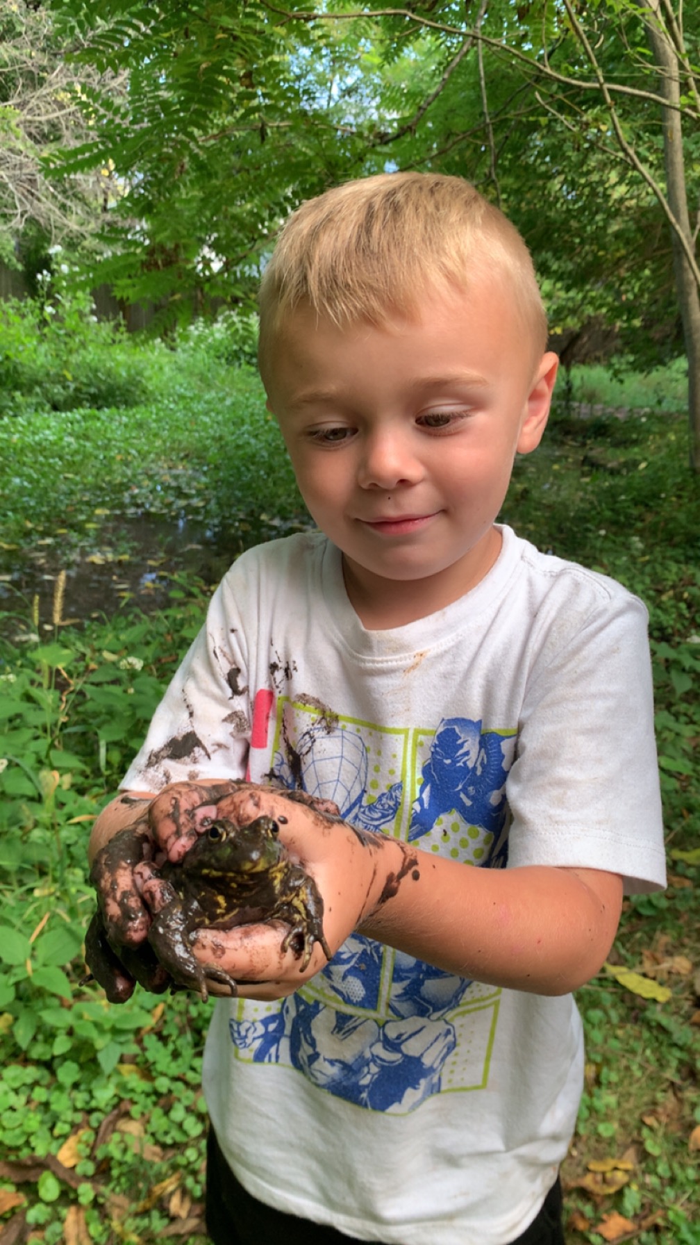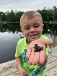 Our son Noah loves the outdoors. He loves catching frogs, tadpoles, fish & any creatures he can get his hands on but also is so gentle.