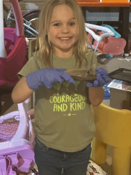 Nola learning about all of the bits of nature so she can nurture them responsibly. At home we pick up trash along the roadside, learn about forest management for the best habitat, and fight invasive species like Multiflora Rose and Autumn Olive. Nola is a fierce defender of those who cannot defend themselves and enjoys standing up for habitat protection. She is a great communicator for her age and passionately tells anyone who will listen about her favorite animals or nature finds.