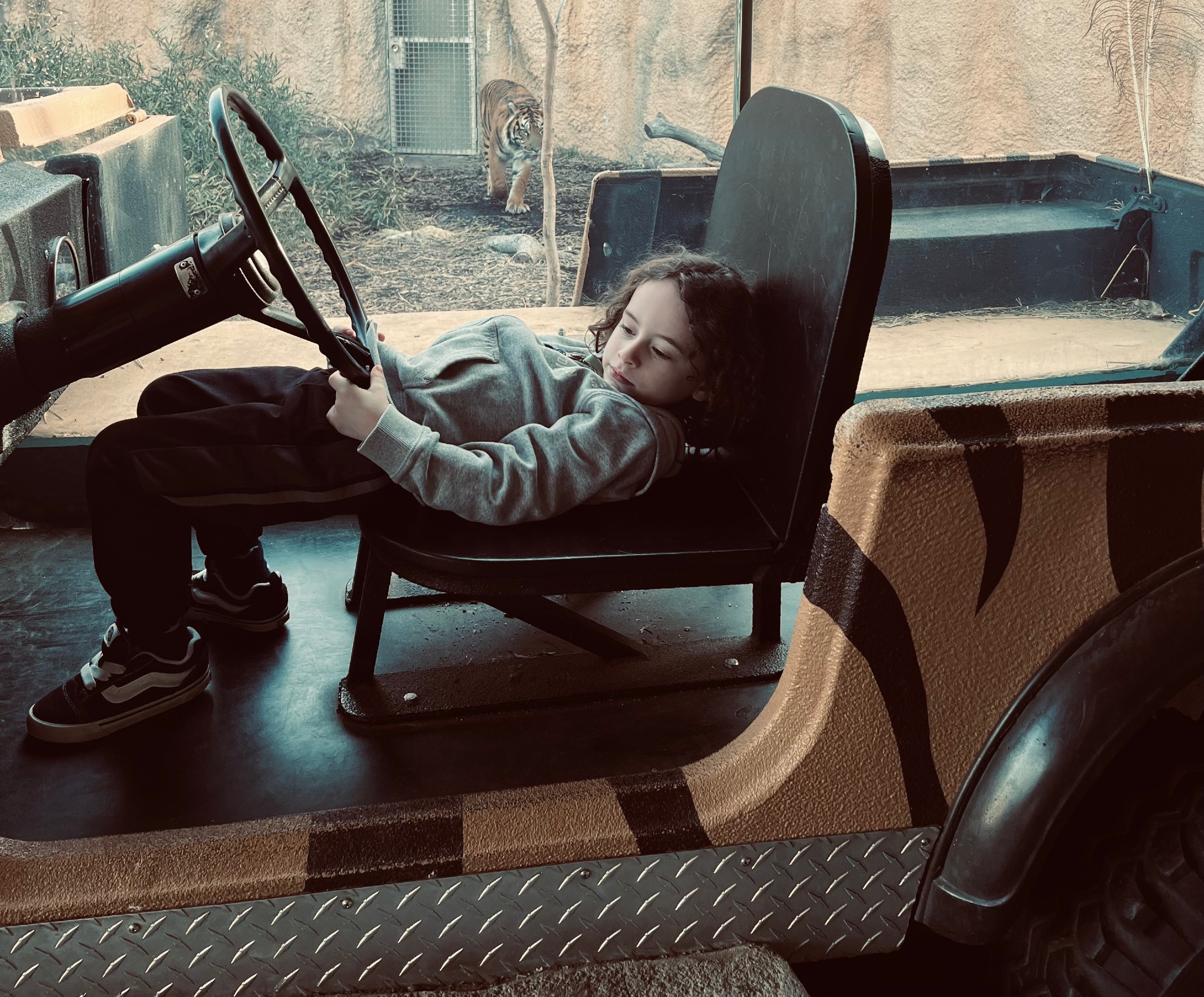 Tiger because he loves the beauty of their coat and their eyes. He likes the hunter animals especially. His second favorite is the snow leopard like he saw at the Omaha zoo!