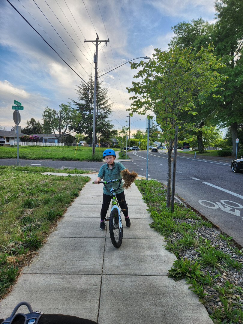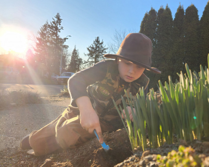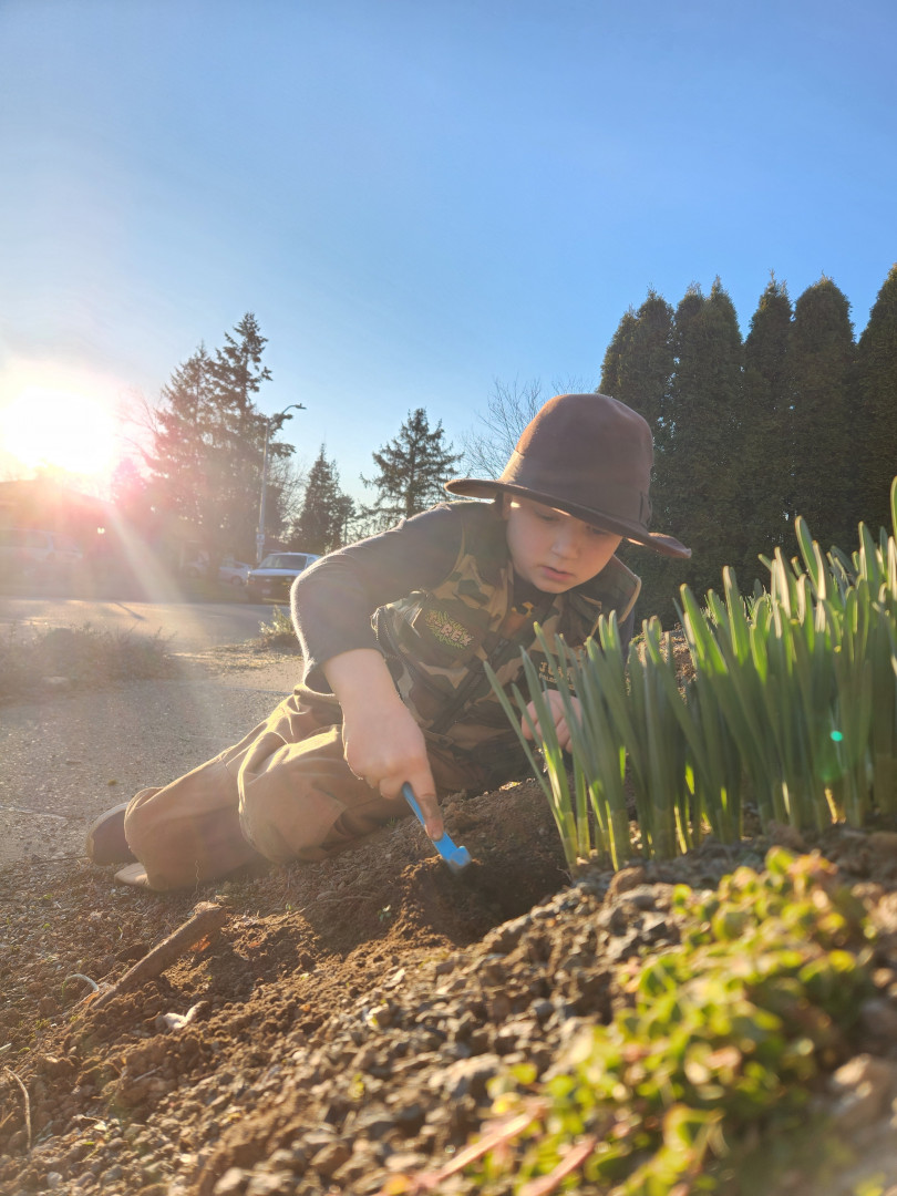 He loves exploring and learning how things work. He regularly helps with planting and yard work and seeks out time to explore outside